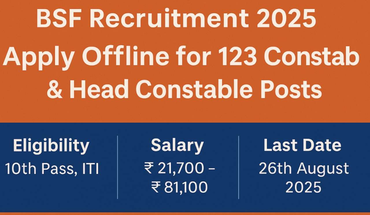 BSF Recruitment 2025 is now open for 123 Constable and Head Constable posts. Apply offline before 26 August 2025. Get full details on eligibility, age limit, salary, and application process here.