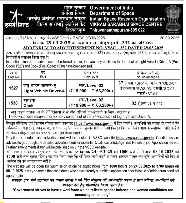 The Indian Space Research Organisation (ISRO) – Vikram Sarabhai Space Centre (VSSC) has announced its latest recruitment drive for 39 vacancies across multiple posts including Driver, Cook, and Assistant (Rajbhasha). The VSSC Recruitment 2025 Notification (Advt No. VSSC-332) was first published in Employment News from 29 March to 04 April 2025, and applications have been reopened from 24 September to 08 October 2025.