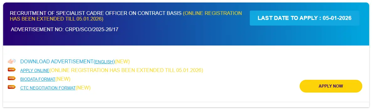 The SBI SO Online Application 2025 process started on 02 December 2025, and the last date to apply has been extended till 05 January 2026. Eligible candidates can apply online through the official website bank.sbi.